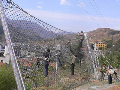 作用原理上類似于噴錨和土釘墻等面層護坡體系,但因其柔性特征能使系統將局部集中荷載向四周均材質:鋼絲繩網、普通鋼絲格柵(常稱鐵絲格柵)和TECCO高強度鋼絲格柵勻傳遞以充分發揮整個系統的防護能力,即局部受載,整體作用,從而使系統能承受較大的荷載并降低單根錨桿的錨固力要求。